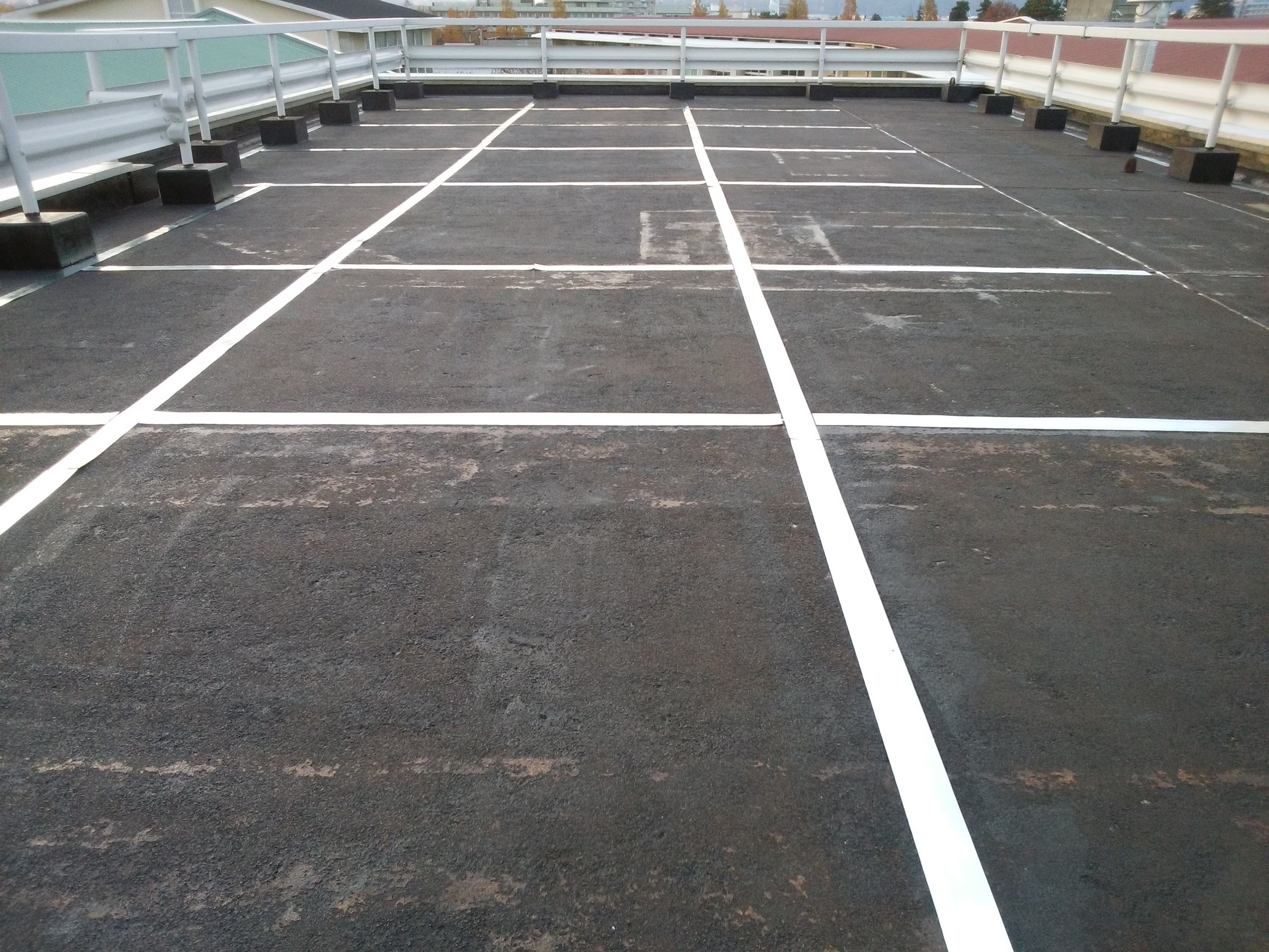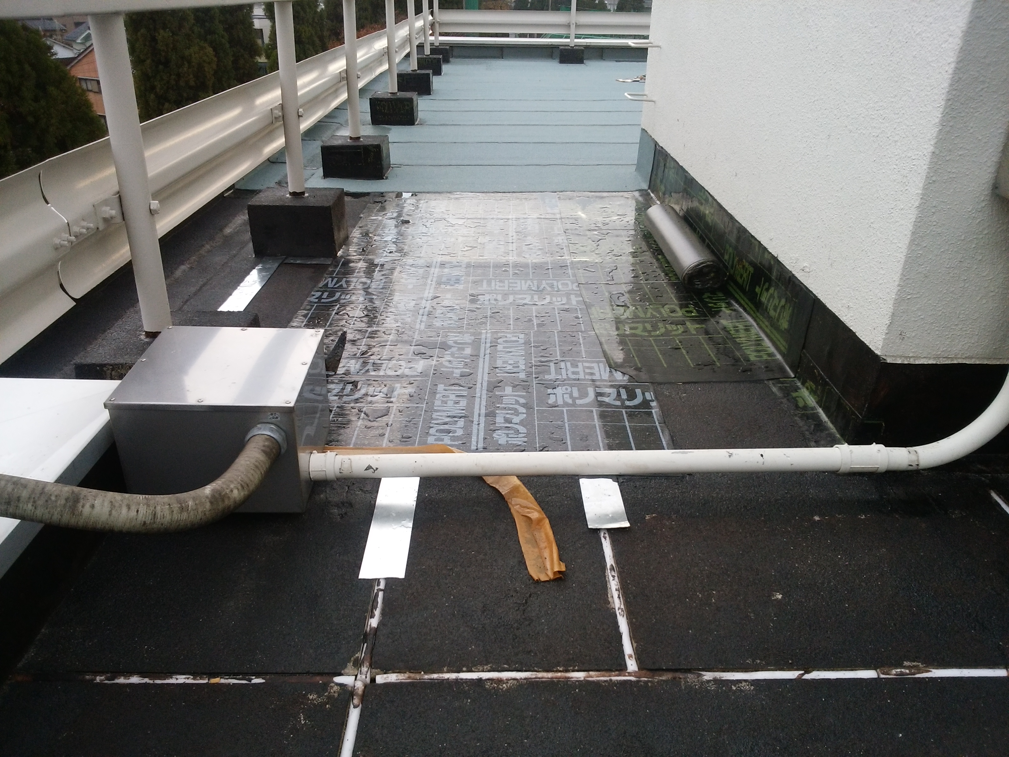 ③改質アスファルト2層目貼付(画像奥の青っぽく見えるあたり)