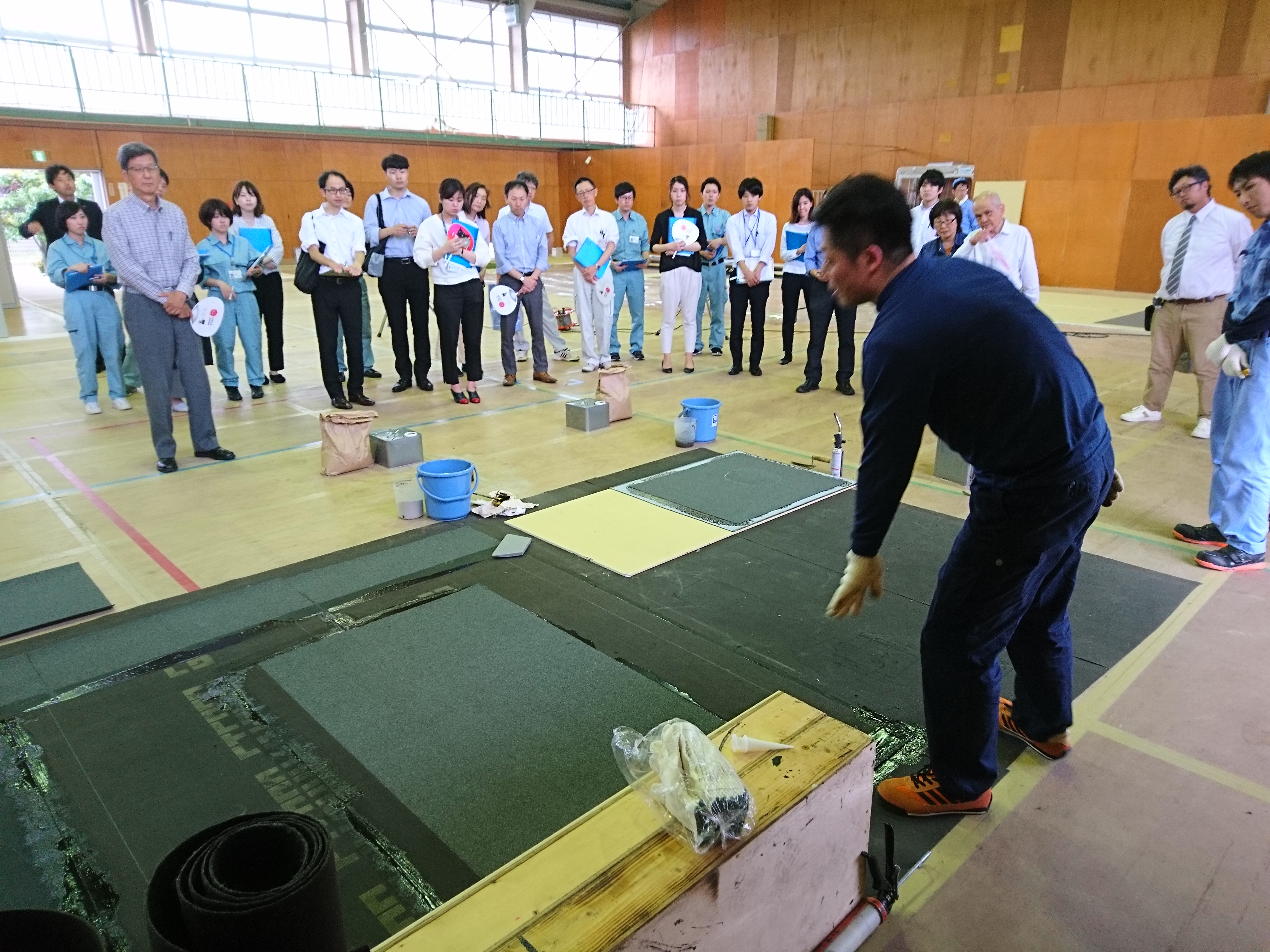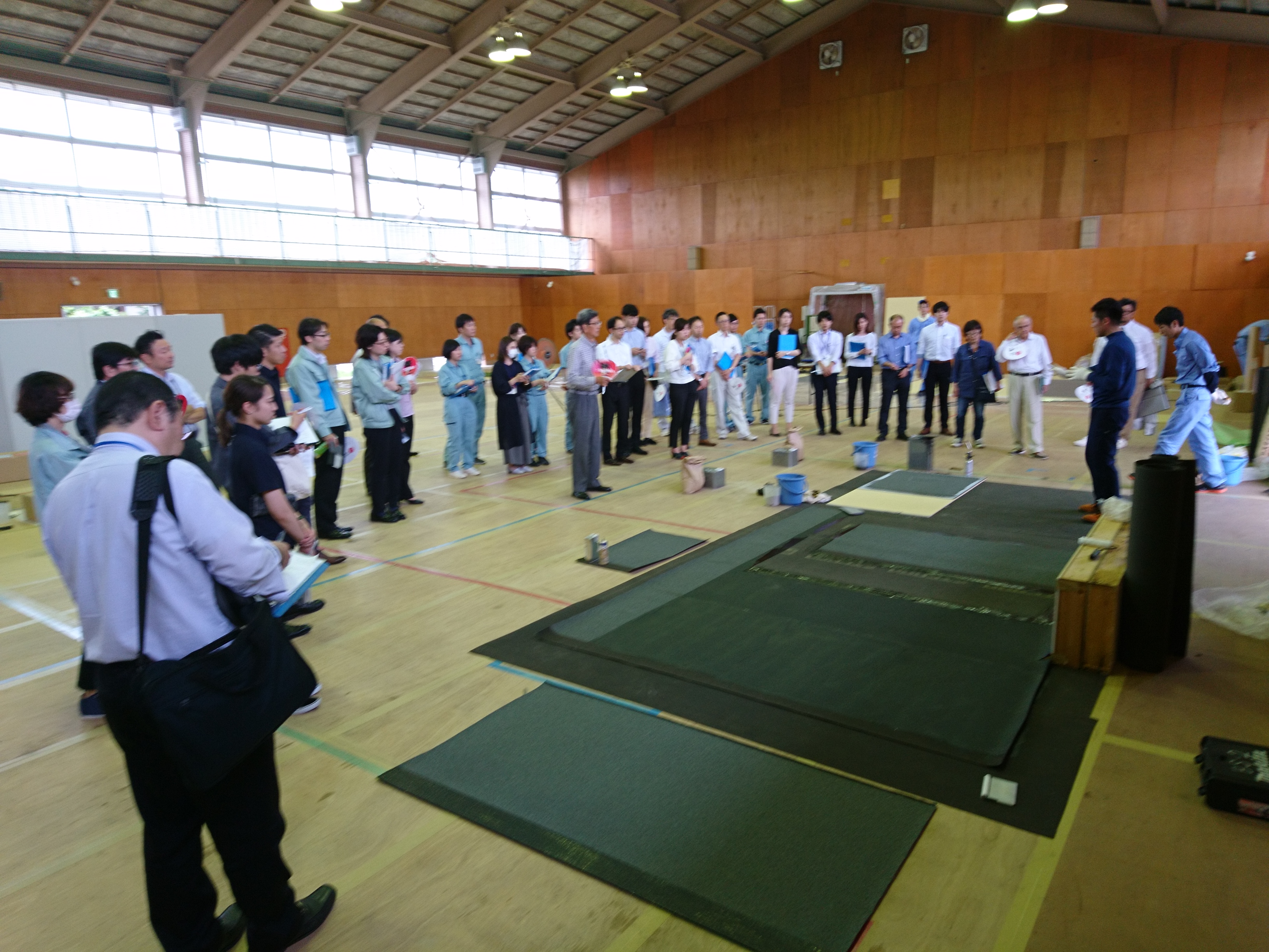 続きまして、体育館に移動してからの「防水施工デモンストレーション」を行いました。